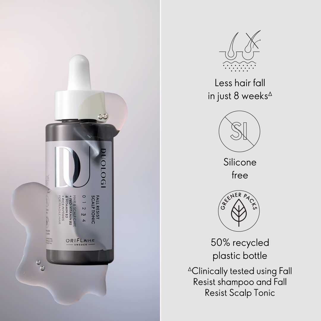 تونیک ضد ریزش DUOLOGI Fall Resist Scalp Tonic با فرمولاسیونی تخصصی، به کاهش ریزش مو کمک کرده و باعث افزایش تراکم و استحکام موها میشود. نتایج قابل مشاهده تنها پس از ۸ هفته استفاده منظم قابل احساس است.